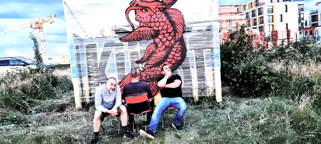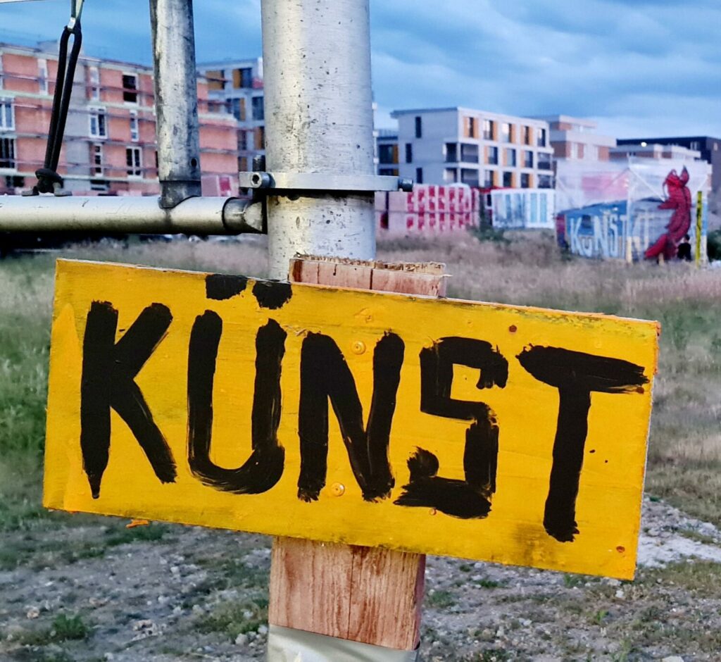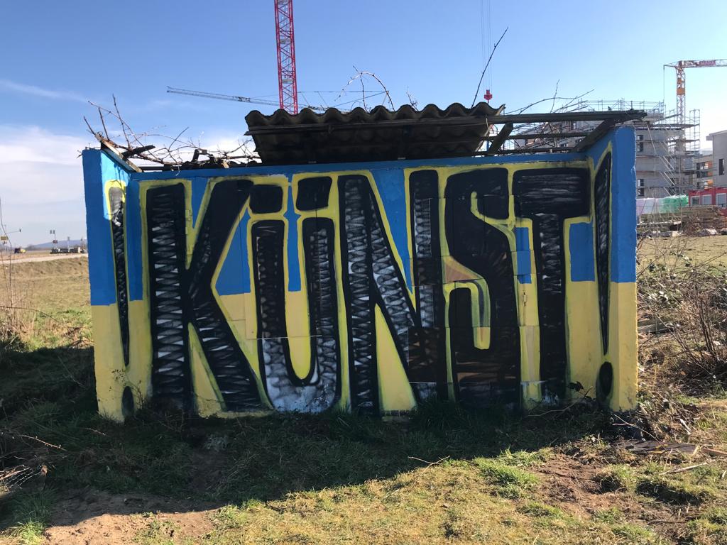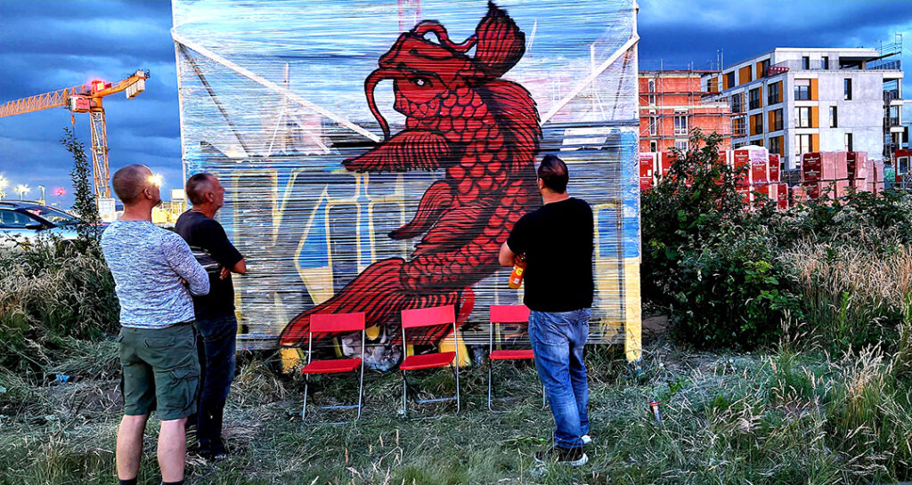 Am Morgen des 1. Juni ist die kleine Hütte auf dem Baugebiet der Neuen Stadtmitte in Mörsch ein wenig bunter aufgewacht. Ein überdimensionaler, signalroter Koi-Karpfen prangt nun an der Vorderseite. Daneben gesellt sich eine grellgelbe, fröhliche aufrechte Dachrinnen-Skulptur. Auffällig auch: Das ehemalige Gartenhäuschen hat seine äußere Form verändert. Mit Holzlatten und 100-ten Metern transparenter Folie wurde eine kubische Hülle um das kleine Gebäude konstruiert. Der Fisch scheint nun daher vor dem großen „Künst“-Schriftzug der Gebäudefront zu schweben. Nahezu zum Anfassen streckt sich der plastisch gesprayte Körper über das marode Gebäudedach hinaus. Ein bemerkenswerter Effekt.