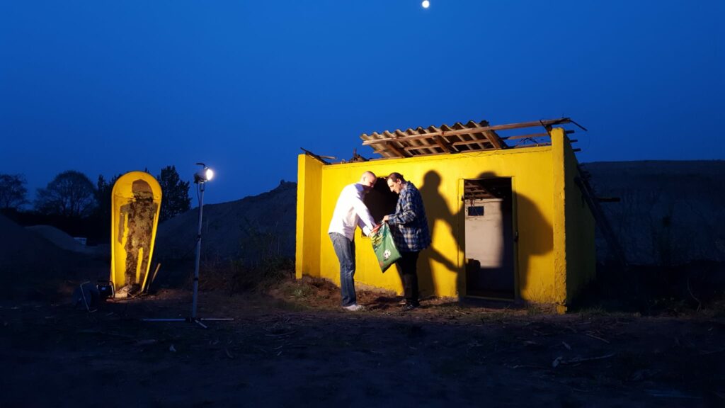 In Abstimmung mit den Behörden wurde erst entrümpelt, dann gepinselt. Signalgelb. In den Nachtstunden und bei Flutlicht wurde letzte Hand angelegt und abschließend die Skulptur „The last Wonn‘ standing“ fertiggestellt. Eine umfunktionierte Zinkwanne aus Hüttenbestand. Ergebnis: Aus dem vormals unscheinbaren Hüttlein wurde nun ein von weitem sichtbares Stück „Kunst im