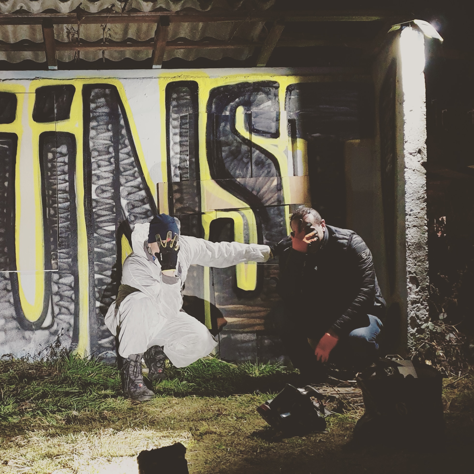 Kreativ auf der Baustelle: In einer abendlichen Aktion haben Giorgio Silvano, Thorsten Nees und Nikolaus Zirwes eine alte Gartenhütte zu einem eindrucksvollen Streetart-Kunstwerk gemacht.
